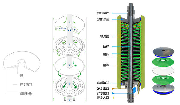 料液(廢水)通過入口進入壓力容器中,經(jīng)內(nèi)部圓形導流盤流入分離膜,分離膜片為圓形結(jié)構(gòu),液體在導流盤和膜片之間折返流動,導流盤表面有一定方式排列的凸點,使得液體在流動過程中形成強烈的湍流,增加透過速率和自清洗功能,有效避免膜堵塞和濃度極化現(xiàn)象,延長膜片的使用壽命和保持高的過濾通量,清洗時也容易將膜片上的積垢洗凈,保證膜組件適用于惡劣的進水條件。